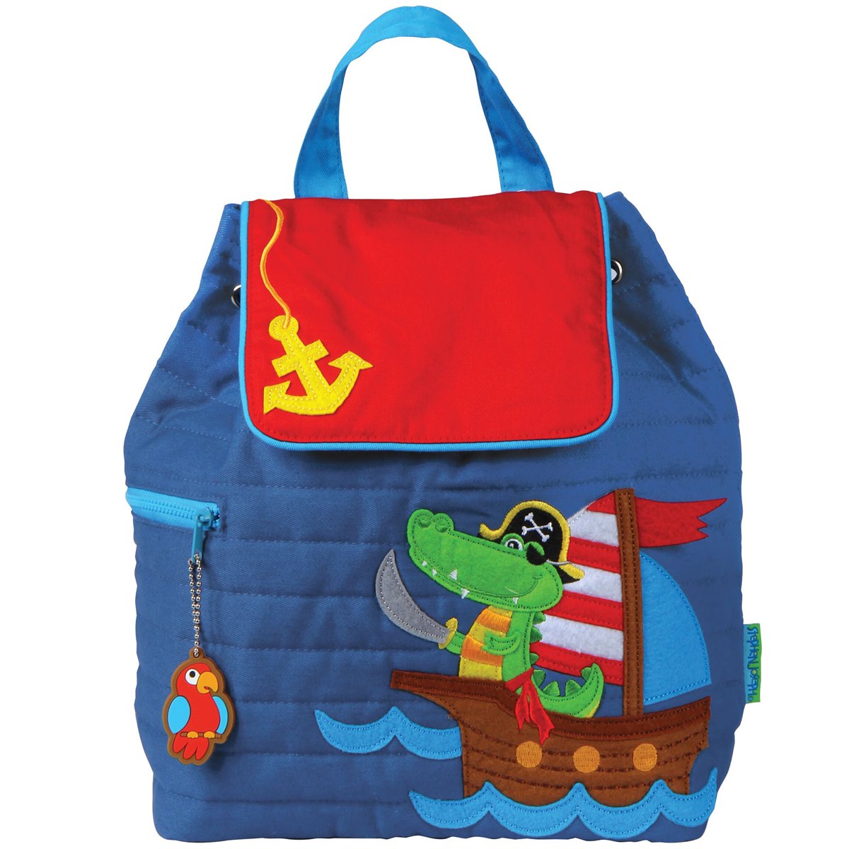 The Stephen Joseph Alligator Pirate Quilted Backpack is sized for toddlers and preschool aged children. The Alligator Pirate backpacks are approximately 13 inches wide and 12 inches high (plus the handle) and navy blue in color with a red closure flap. The outer backpack material is made of 100% cotton and the bag is fully lined on the inside. The backpacks come with a magnetic snap closure, an additional draw string closure, straps for carrying, and a side pocket with a coordinating zipper pull. The Stephen Joseph backpacks have a beautifully embroidered design and can be personalized with an embroidered monogram or name on the closure flap. Each backpack can be embroidered with up to 10 characters of text with your preferred selection of font style and thread color. The recommended thread colors for the embroidery on this item are black, white, yellow, and navy blue.